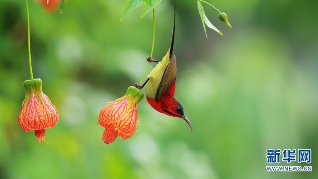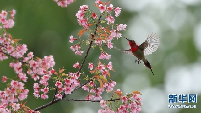 德宏州芒市,鸟儿在花间飞舞。拍摄这张照片的时候,距离立春尚有10多天,但春天已提前到达了有着“黎明之城”之称的芒市,小城一派鸟语花香,生意盎然(摄于1月20日)。新华网发(郑山河/摄)