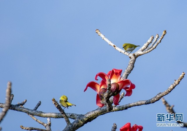 保山市龙陵县,怒江之畔,木棉花开引鸟来(摄于2月16日)。新华网发(尹磊/摄)