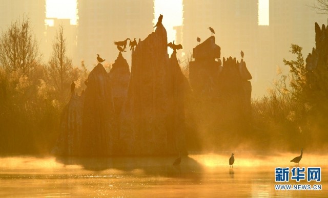 红河州弥勒市湖泉生态园内,成群的水鸟沐浴在晨光里(摄于2月16日)。新华网发(普佳勇/摄)