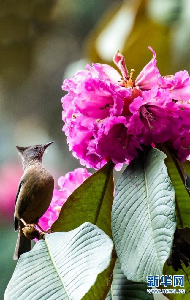 高黎贡山国家级自然保护区,大树杜鹃迎来盛花期,引得鸟儿前来吸食花蜜(摄于2月26日)。新华网发(郭康/摄)