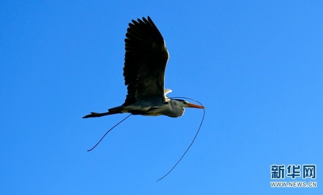 红河州弥勒市湖泉生态园内,一只鸟儿嘴衔枝筑巢(摄于2月16日)。新华网发(普佳勇/摄)