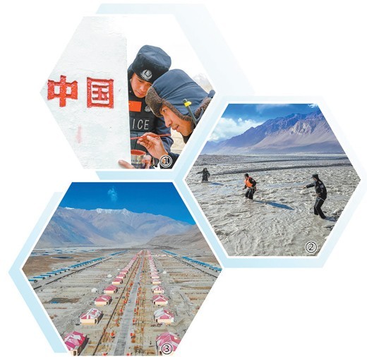 图①为边境巡逻途中,张志昊(左)和阿吉为界碑描红。
