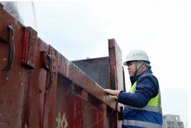 项目物资部经理张坤检查进场车辆,严把材料质量关。