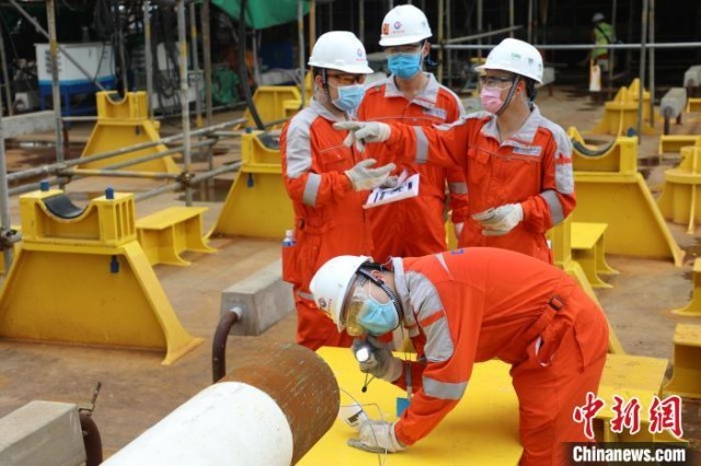 2020年8月27日,青年员工在船体上方检查验收天然气管线,确保管线内部结构完好。 中国海油海南分公司供图