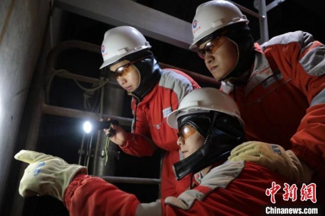 2021年1月8日,船系青年员工在立柱底部对船体内壁进行精细排查,确保排除船体所有安全隐患。 中国海油海南分公司供图