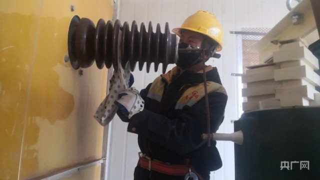 电力线路工在清洗绝缘设备(央广网发 周贺 摄)