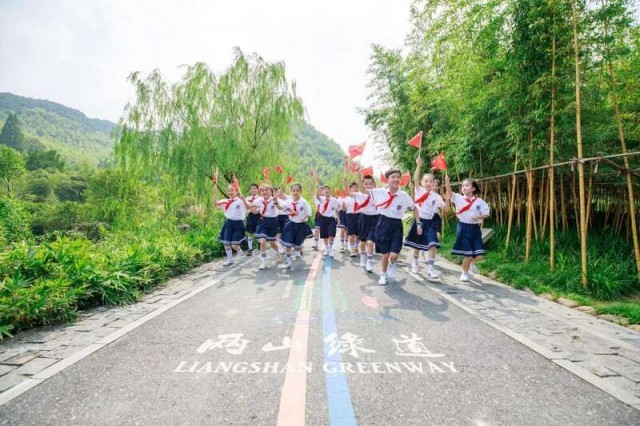 少先队员奔跑在余村的两山绿道上。 安吉团县委、县少工委供图