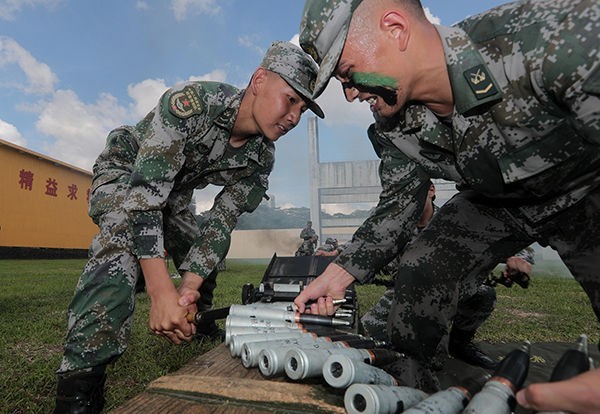 ↑驻香港部队某旅装步一连官兵装填弹链(5月28日摄)。新华社发(易定 摄)