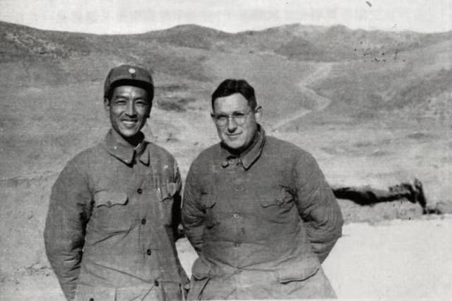 1944年10月,耿飚和美军观察组组长保罗·德穆克在从延安赴晋察冀途中合影。