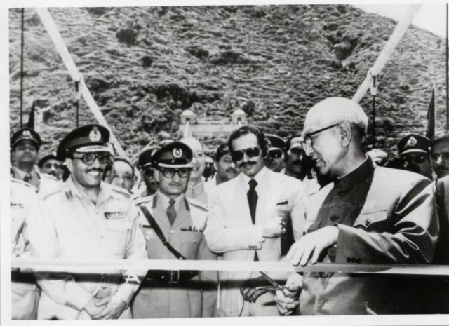 1978年6月,国务院副总理耿飚与巴基斯坦总统齐亚·哈克(前左)共同为中巴公路剪彩。