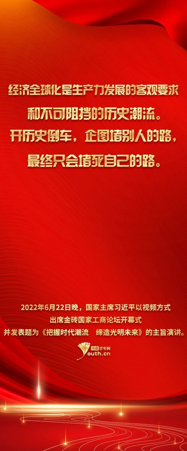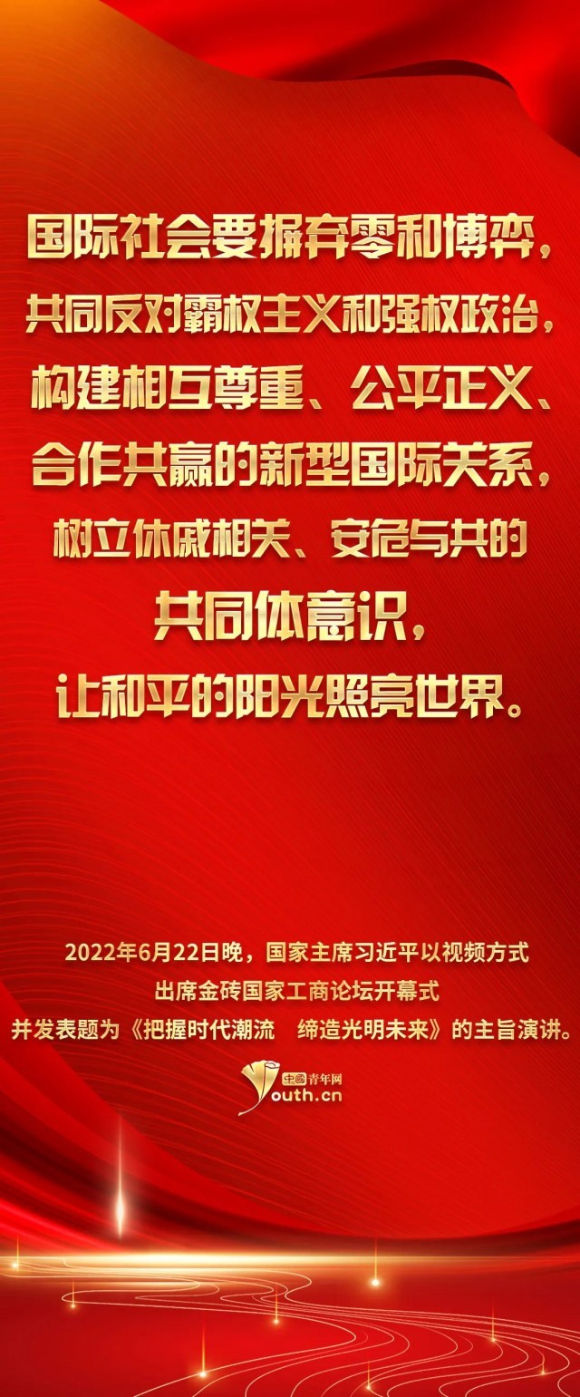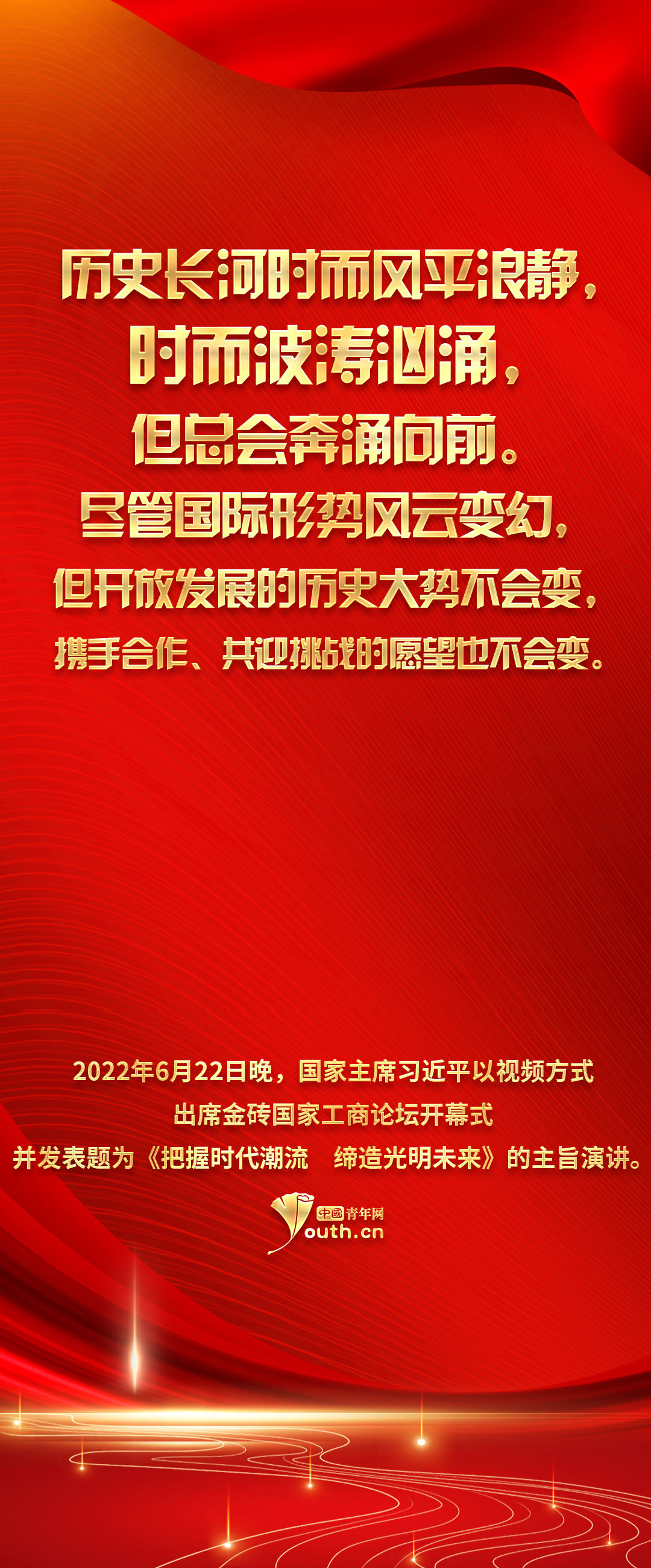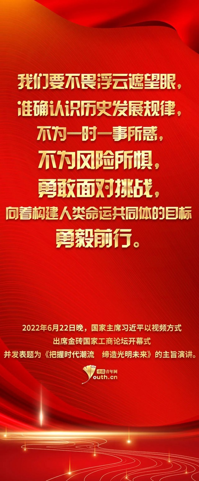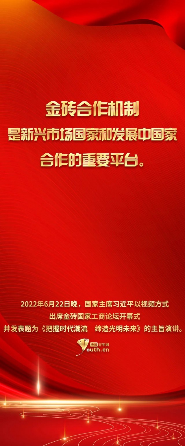 6月22日晚,习近平主席以视频方式出席金砖国家工商论坛开幕式并发表题为《把握时代潮流 缔造光明未来》的主旨演讲。