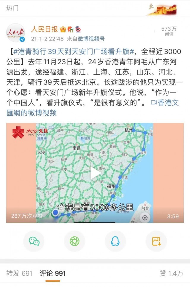 2020年,一次近3000公里单车骑行之旅曾让赖都冲上热搜话题榜,受到全网网友关注。那次长达39天的长途跋涉只为实现一个心愿——到北京,看天安门广场新年升旗仪式。“作为一个中国人”,看升旗仪式,“是很有意义的”,这个香港小伙说。
