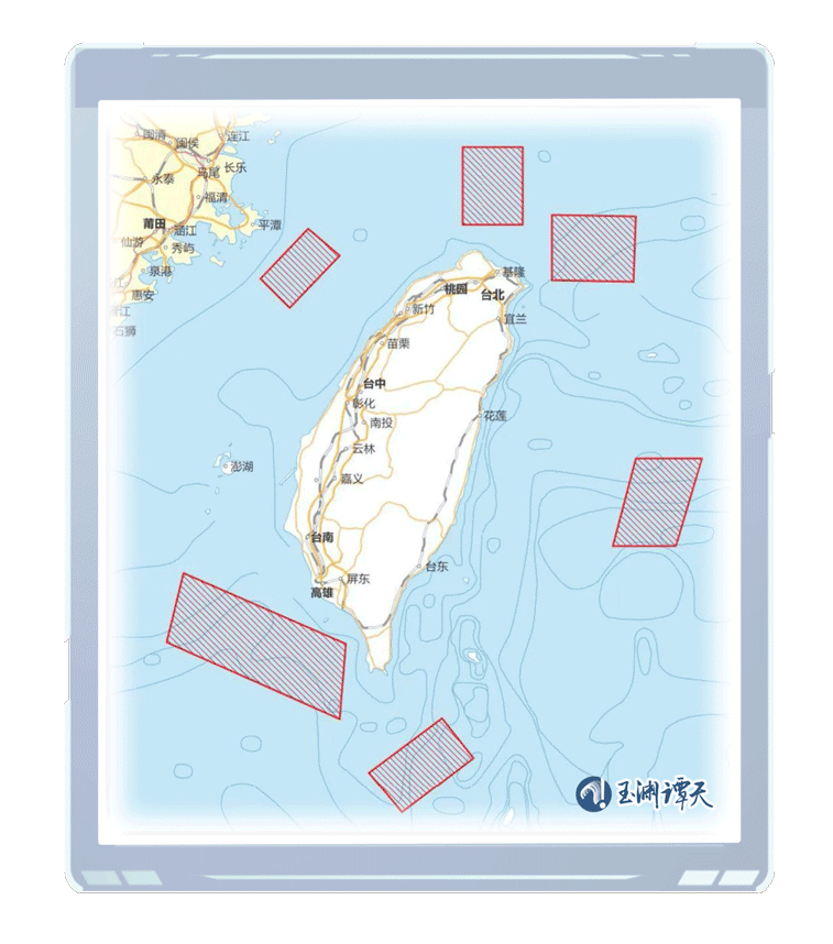把上面几个区域连起来,可以看出,解放军已经对台湾岛形成了前所未有的包围态势。