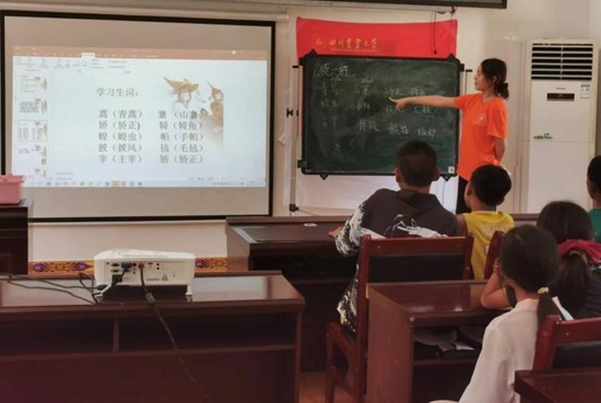 川农“语”结童心团队成员正在给孩子们教授普通话。