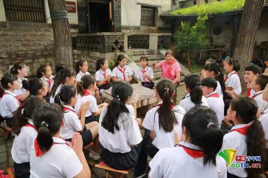 焦家小院话传承。裕禄学校学生(焦裕禄书记的小小校友)聆听焦家小院守护人赵新爱(焦裕禄侄媳妇)老人讲述感人故事。山东省淄博市焦裕禄纪念馆供图。