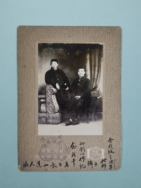 在上海市团校“中国共产主义青年团与上海”展陈中,另一件“镇展之宝”引起了公众的注意。8月21日当天的展陈开幕式上,还特别举行了简单而又隆重的捐赠仪式。这是由俞秀松养子俞敏捐赠的一张照片——上海共青团首任书记俞秀松和他在浙江一师的同学邵人模在浙江杭州的合影,上面还有俞秀松的亲笔题字。这是这张照片首次在公开场合展出(见图二)。