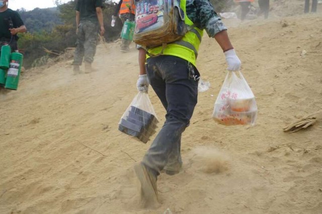 凌晨两点,5号点位传来了快餐,陈正乾和志愿者们又饿又累,也不舍得吃,留给了救火官兵们。就连一包豆干,也顺利通过5号点向上传着。下山时,陈正乾装满药品的包,只剩下一两支掉落在底部的葡萄糖。