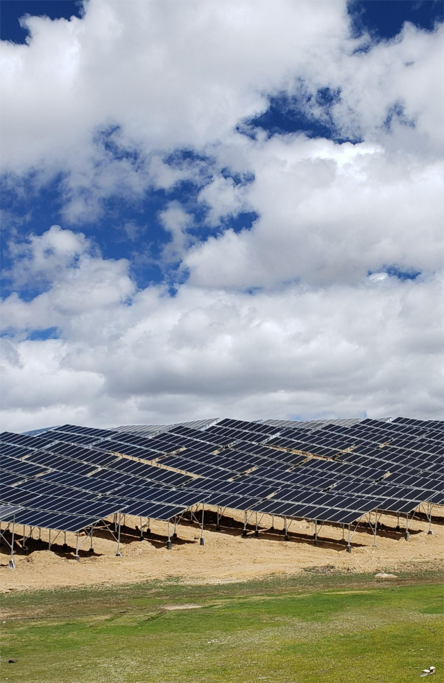 高山白雪,蔚蓝苍穹。在海拔4700米、空气含氧量不到平原地区50%左右的雪域高原上,一抹“国家电投绿”与雪域蓝天交相辉映。在海拔4700米之高的拉萨市当雄县羊达乡,国家电投当雄10MW牧光互补并网光伏电站坐落于此,它是世界海拔最高的并网光伏电站。羊易光伏电站总装机规模10MW,电站日均发电量4.58万千瓦时,年均可实现发电量约2000万千瓦时,可满足拉萨市约4万户农牧民用电需求,不仅极大改善了西藏电力不足、电压不稳的局面,每年还可节约标准煤6000吨,减少排放温室效应气体二氧化碳约2万吨。