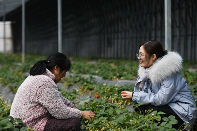 2月22日,在安徽省滁州市定远县吴圩镇,王萌萌(右)与草莓种植户交流。新华社记者 张端 摄