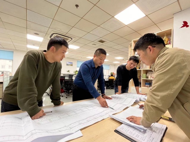 徐斌(左二)和同事在讨论设计方案。2022年10月摄于中铁第一勘察设计院。