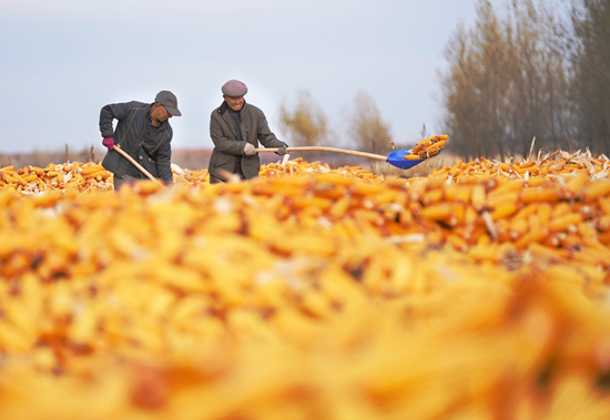 10月15日,在黑龙江省拜泉县上升乡上升村,农民在翻晒玉米。