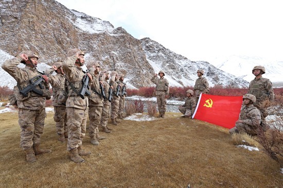 近日,正在喀喇昆仑高原驻训的新疆军区某红军团组织开展“学贯二十大 赞颂新成就”主题党日活动,官兵面对党旗庄严宣誓,坚定戍边守防的信心与决心。孙安全/摄