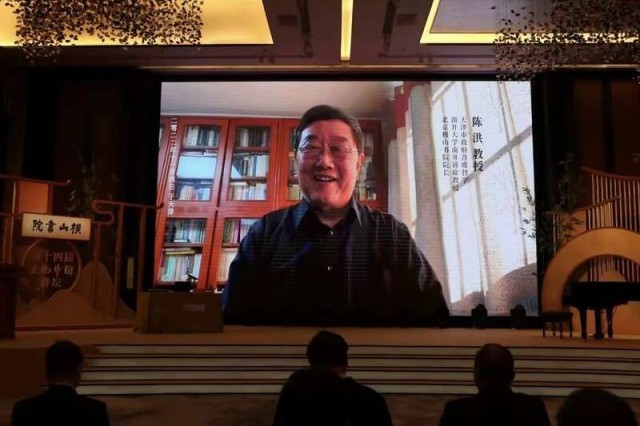 11月6日,浙江省杭州市萧山区,第十四届文化中国讲坛现场,天津市政府首席督学、南开大学南开讲席教授、北京横山书院院长陈洪视频致辞。 中青报·中青网记者 孔斯琪/摄