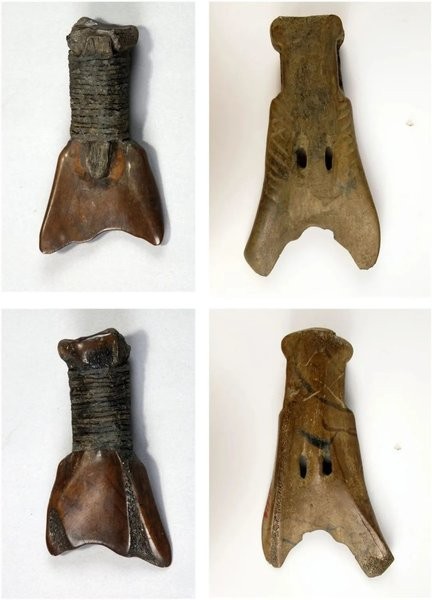 这一件柄上绑扎着条缕分明的藤条,藤条下残存着一块木棒遗迹的骨耜,把古籍记载中关于“耒耜”的古老形象,清晰地展现在我们面前。在遥想先民们“执耜而耕”劳作场景的同时,我们也可追忆远古祖先驯化野生稻的那一条漫长、艰辛的足迹。