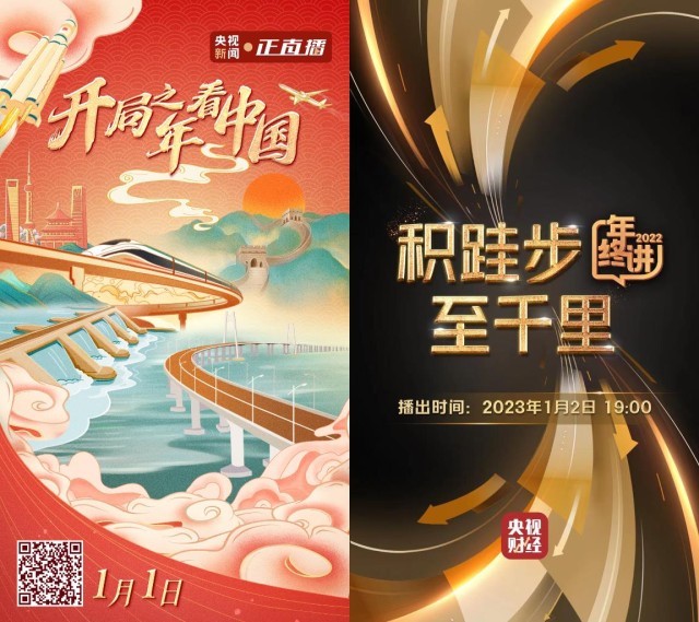 辞旧迎新之际,央视综合频道(CCTV-1)、新闻频道(CCTV-13)、央视新闻12月31日起连续三天推出特别节目《奋楫新征程》,回顾中国空间站建成、首款国产大飞机C919试飞等2022年我国在各方面取得的突出成就,讲述普通百姓的奋斗故事,展现国家发展的新蓝图、奋楫扬帆的新力量和对未来生活的新愿景。中国之声推出大型记录报道《民生样本,年度记录》,十位记者分别对各自关注的基层点开启第十一个年头的样本观察和追踪记录,反映生活的新变化新发展。央视财经客户端推出大型主题跨年演讲节目《积跬步至千里——2022年终讲》,权威嘉宾齐聚一堂,聚焦2022年不同领域的点滴突破,致敬每一个虽小但影响深远的“跬步”,展现出中国经济行稳致远的信心!