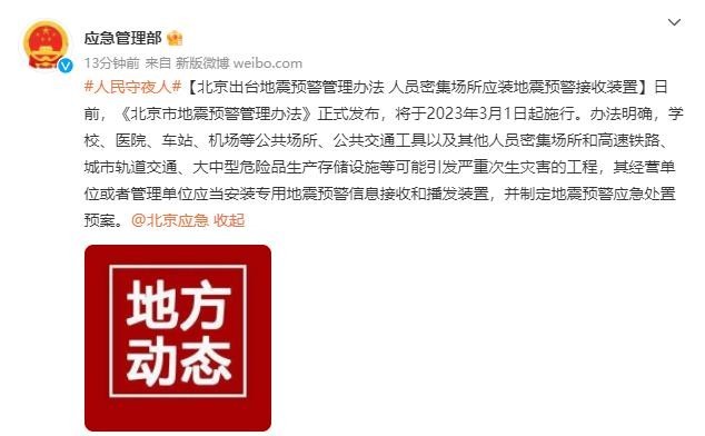 据@应急管理部 微博消息,日前,《北京市地震预警管理办法》正式发布,将于2023年3月1日起施行。办法明确,学校、医院、车站、机场等公共场所、公共交通工具以及其他人员密集场所和高速铁路、城市轨道交通、大中型危险品生产存储设施等可能引发严重次生灾害的工程,其经营单位或者管理单位应当安装专用地震预警信息接收和播发装置,并制定地震预警应急处置预案。