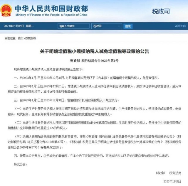 公告提出,自2023年1月1日至2023年12月31日,对月销售额10万元以下(含本数)的增值税小规模纳税人,免征增值税。