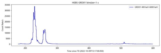 由中科院高能物理研究所研制的高能爆发探索者(HEBS)于北京时间2022年10月9日21时17分,与我国慧眼卫星和高海拔宇宙线观测站同时探测到迄今最亮的伽马射线暴(编号为GRB 221009A)。根据HEBS的精确测量结果,该伽马暴比以往人类观测到的最亮伽马射线暴还亮10倍以上。由于该伽马射线暴的亮度极高,国际上绝大部分探测设备均发生了严重的数据饱和丢失、脉冲堆积等仪器效应,难以获得精确测量结果。HEBS凭借创新的探测器设计以及新颖的高纬度观测模式设置,探测器经受住了高计数率的考验,获得了高时间分辨率的光变曲线,以及10千电子伏至5兆电子伏的宽能段能谱。HEBS极为宝贵的精确测量结果对于揭示伽马射线暴的起源和辐射机制具有重要意义。