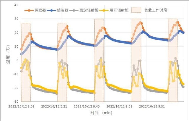 中科院微小卫星创新院的可展收式辐射器成功在轨实现首次应用,辐射器执行机构已顺利完成六十余次展开和收拢动作,连续五轨动态试验结果(如图10)表明环路热管-可展收式辐射器集成系统在负载工作时段启动性能良好,辐射器连续展开-收拢可实现散热能力在轨大范围调控。