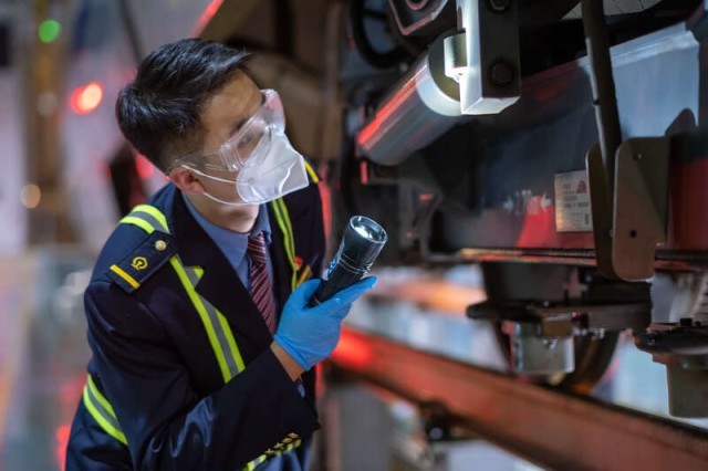 动车组随车机械师赵乐正在进行出库前的巡检作业。梁亮/摄