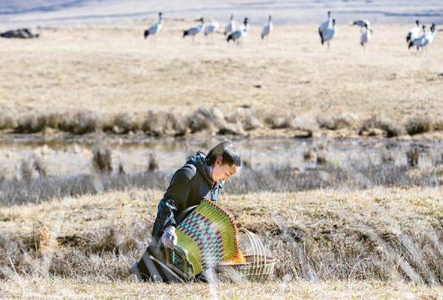 近年来,云南大山包黑颈鹤国家级自然保护区积极实施湿地保护与恢复、湿地生态效益补偿、食物源基地建设等管护措施,使这里逐渐成为黑颈鹤在云贵高原上最重要的越冬栖息地和迁徙中转站。图为2022年12月11日,志愿护鹤员在大山包黑颈鹤国家级自然保护区准备给黑颈鹤投食。 新华社记者 曹梦瑶/摄