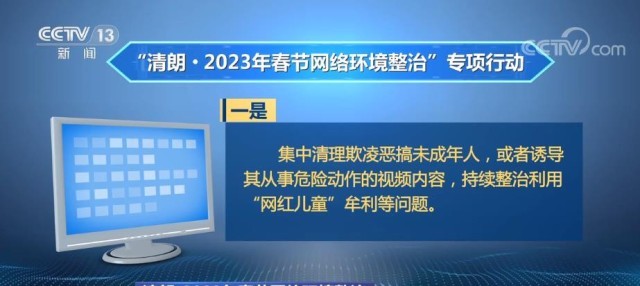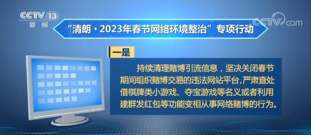 央视网消息:中央网信办1月18日起开展为期1个月的“清朗·2023年春节网络环境整治”专项行动。此次“清朗·2023年春节网络环境整治” 专项行动还将集中查处组织实施网络赌博等违法违规行为,以及重点加大未成年人保护力度。