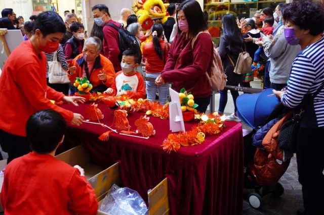 1月22日,香港湾仔区利东街,传统舞龙舞狮表演吸引人们驻足观看。舞狮活动在香港历史悠久,已被纳入香港非物质文化遗产清单。