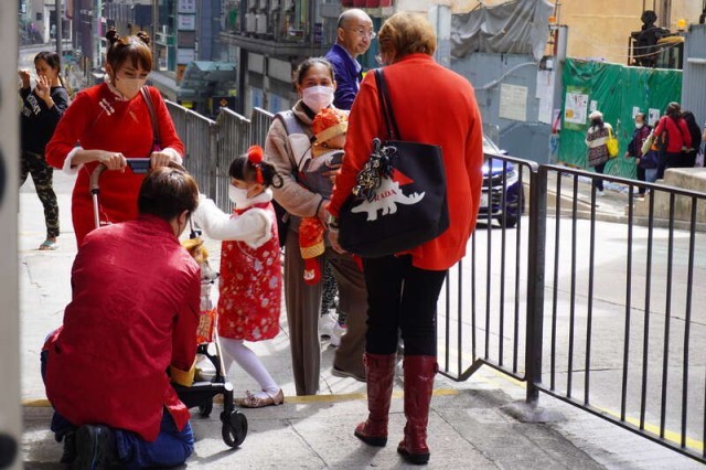 1月22日,香港中西区威灵顿街,人们纷纷换上喜庆的红色衣服。