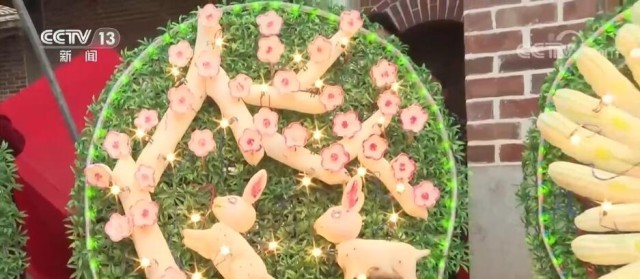 记者:在我身后的这条小巷中正在展演的是莆田地区流传千年的“舞龙弄九鲤”,画面中可以看到一支龙队和一支鲤鱼队正进行游街,走在最前面的是龙头和龙珠。在中国人心中,龙一直是祥瑞之物,人们以舞龙的方式祈求来年风调雨顺、五谷丰登,而“弄九鲤”就表达着人们对鲤鱼跃龙门的美好期盼。此时在我身后的古戏台上正在表演执羽舞,在古戏台的旁边展示了一系列富有莆田特色的元宵习俗。菜头灯是用白萝卜雕刻成各种丰富的造型,然后泡在水里保持新鲜,等到元宵节前一两天再组装成这样的大花盘用于元宵当晚的游灯。在当地甚至还有着“没有菜头灯,不成元宵节”的说法。