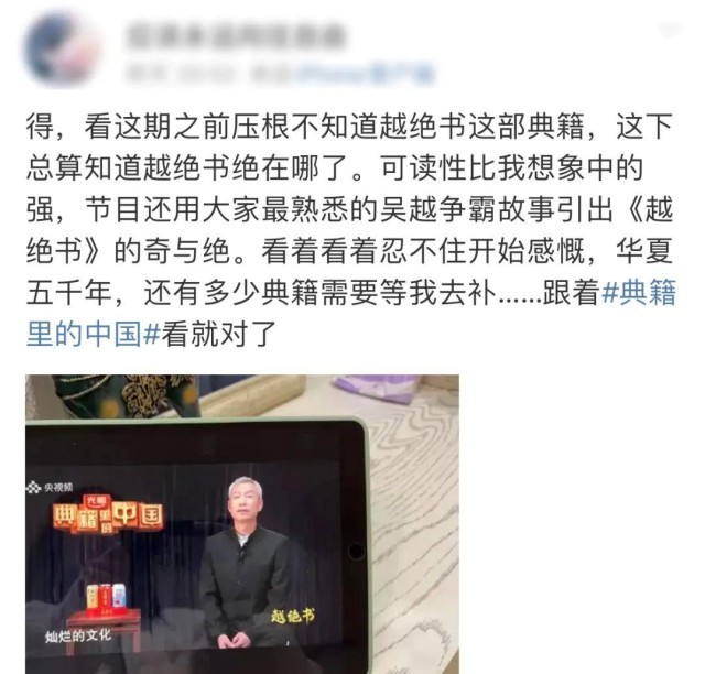 在《典籍里的中国》第二季启播仪式的致辞中,慎海雄台长谈到,《越绝书》中记载着自己家乡浙江千年前波澜壮阔的吴越故事,令人遐思万千。书中传递着的仁义民本思想,至今滋养着这一方土地乃至中国人的精神底蕴。