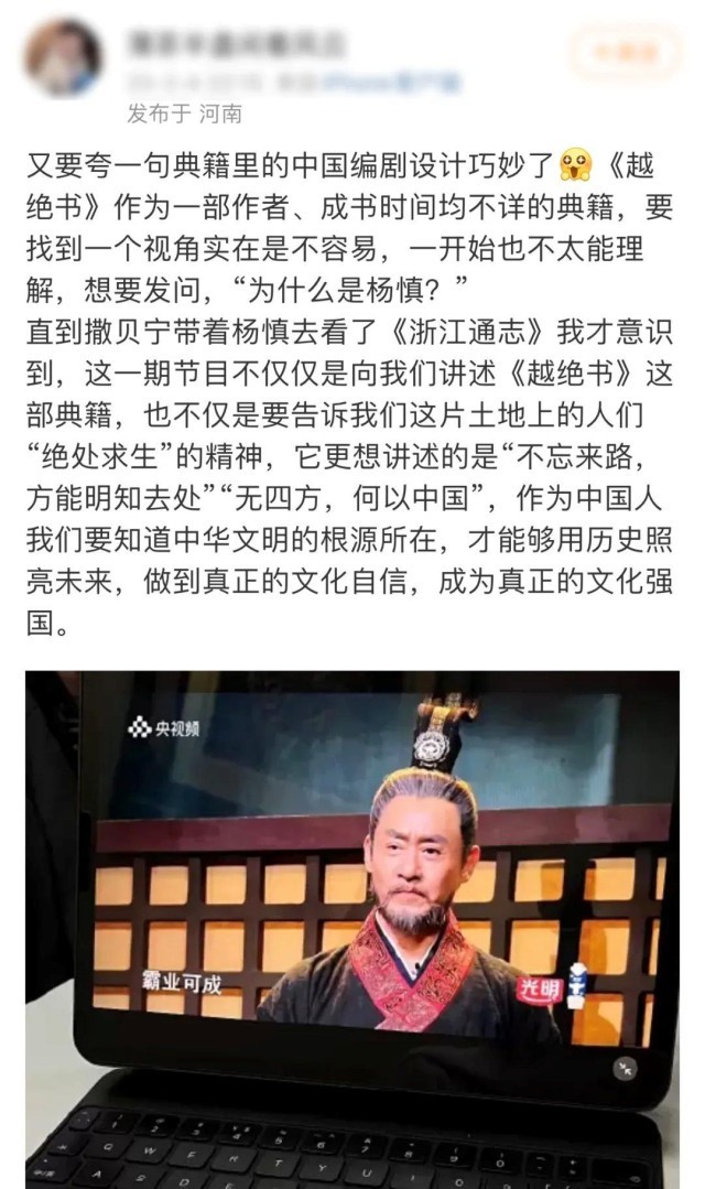 节目中,“当代读书人”撒贝宁与明代史学家、方志学家杨慎对坐共饮,“一壶浊酒喜相逢”。杨慎感慨:“《越绝书》中描绘着我最神往的历史,有我最倾慕的英雄。”