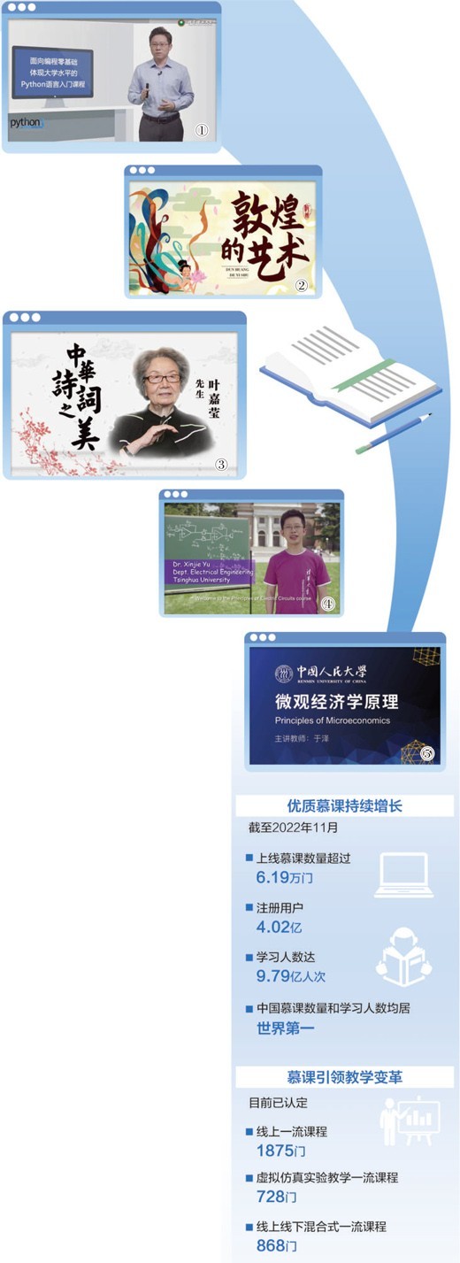 这一场景展现出慕课打破时空限制、让知识无远弗届的魅力。近年来,“慕课西部行计划”持续推进,一方面利用东部师资与技术优势,将优质慕课资源输送到西部高校,另一方面开展常态化师资培训,提升西部高校教育教学“造血”功能。数据显示,仅2022年西部高校开展混合式教学126万门次,参与学习学生数2.1亿人次。
