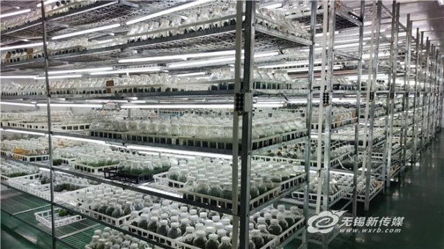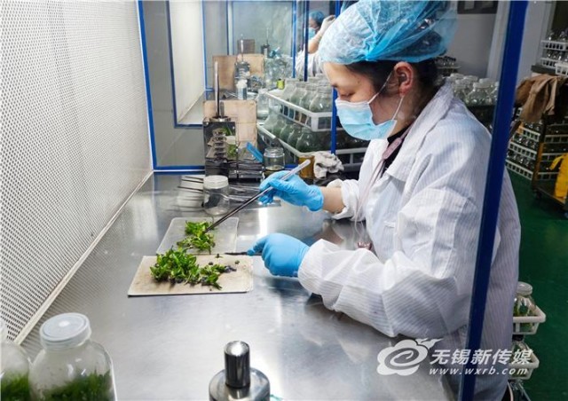 相比水上的热闹场面,江苏东郁植物科技有限公司则显得有些安静,但就在这片安静中,新一年的花卉育苗工作早就悄悄开始了。在生产间里,6位穿着白大褂的工人正在操作台前小心翼翼地进行兰花带芽组织的切分工作。“这后面有个芽,在这里横着切一刀更好……”公司经理胡春宏边指导工人边介绍说。这里采用的是组培技术,利用植物的休眠芽培养后种到培养基上,在人工控制的条件下进行培养,使其生成完整的植株。就拿蝴蝶兰来说,取下其开花株花梗上的休眠芽,将休眠芽经过表面消毒后,再放入配置好营养液的玻璃瓶内,打破它的休眠,将花芽变成叶芽,长出叶芽后再把叶芽分割开来增殖到一定数量,符合计划排单量后就进入生产计划,再进行扩量、长个、生根。在工厂化的生产情况下,一个工人一天可以分割1500至2000棵种苗。