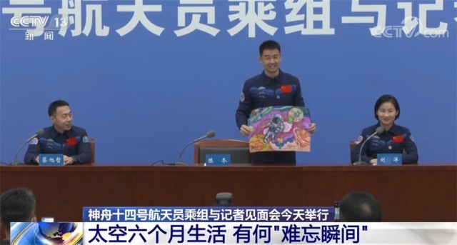 记者会上,航天员陈冬收到了来自家乡特殊教育学校孩子的一幅画作。