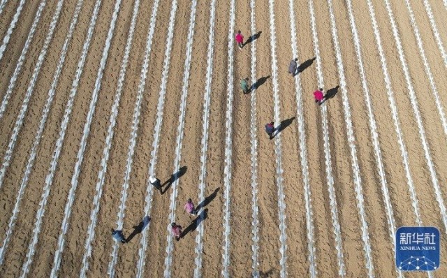 2月19日,在河南省济源市承留镇的农田里,农民对白菜苗覆土。新华社发(段二平摄)