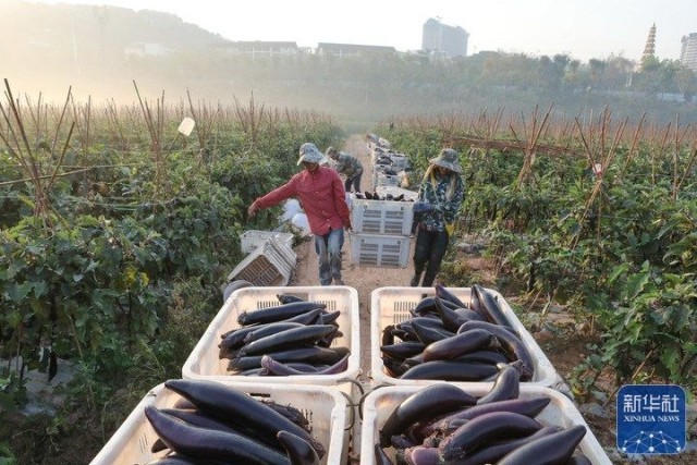 2月19日,在云南省景洪市曼弄枫街道的一处蔬菜种植基地,农民在采摘茄子。新华社发(李云生 摄)