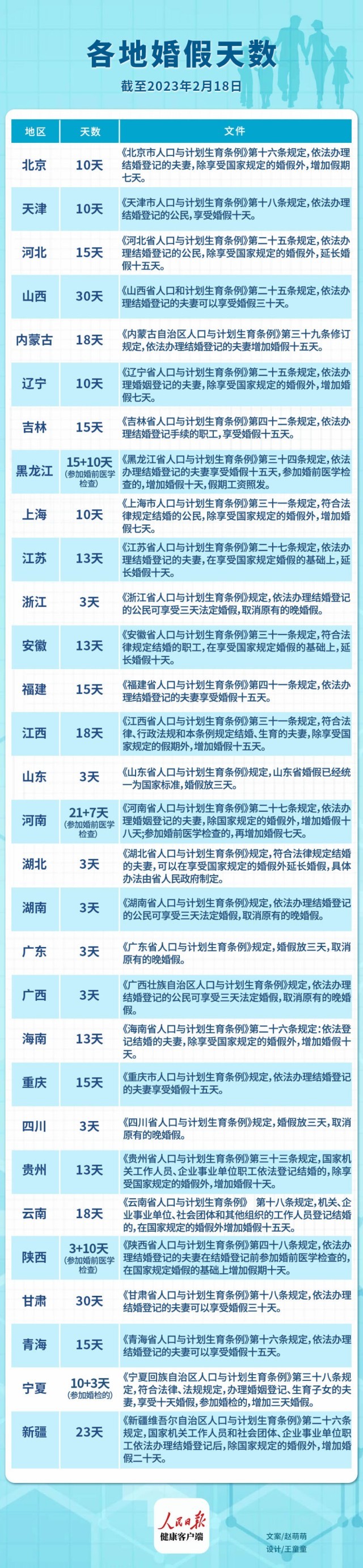 此外,黑龙江、河南、陕西、宁夏等地还增加了对于参加婚前医学检查的夫妻,增加婚假的规定,河南最长可达28天。