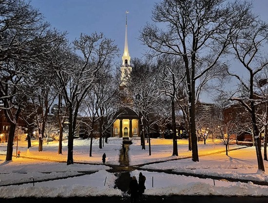 2022年年初大雪后,王珂在哈佛大学怀德纳图书馆门前拍摄。