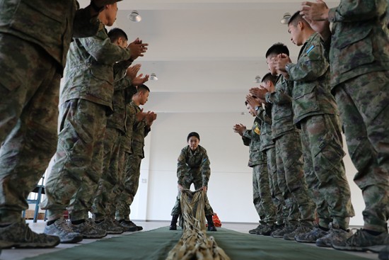 只见学员们默契配合、熟练操作,不一会儿阻力伞就包装完毕,平均完成时间比训练之初快了30多秒,赵莉脸上露出了满意的笑容。