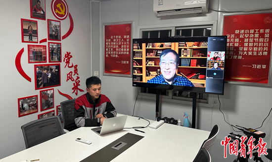 2月28日,北京市西城区虎坊路顺丰快递站党员活动室,刘阔与银燕正在通过线上会议的形式进行对谈。中青报·中青网见习记者 王雪儿/摄